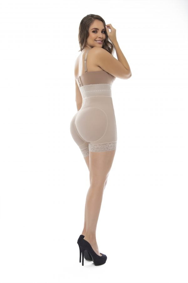 Ultra-enhancing wide waist hiphugger girdle, hassilicone lace on the leg, frontal two-level clousure with perineal zipper, natural enhancement in gluteus with grater capacity in the hip area, high control inthe whole area abdomen with 10cm elastic in the lower part of bust that Helps to shape the figure, plastic rods in the elastic preventing the elastic from rolling up.