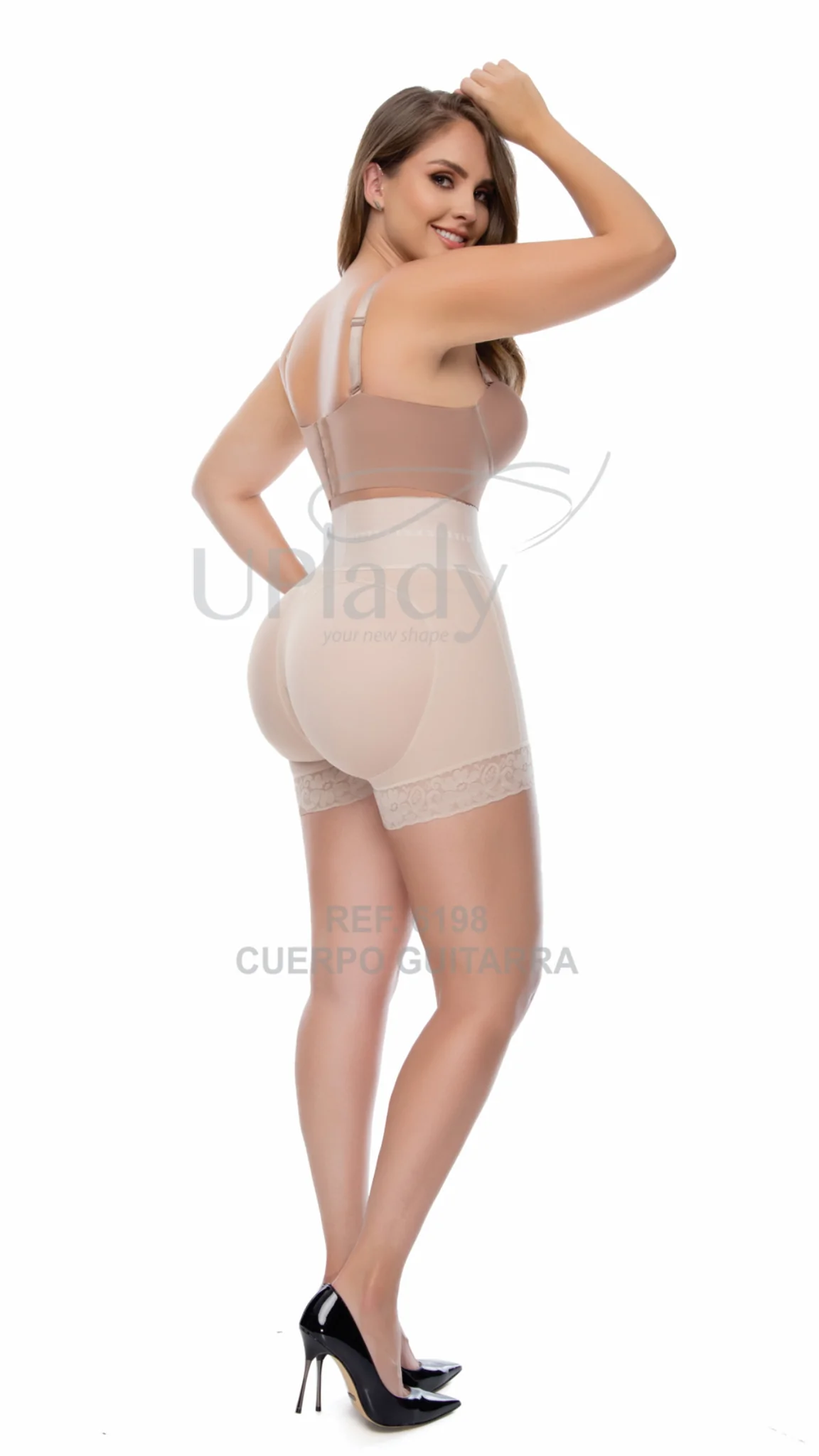 Ultra-enhancing wide waist hiphugger girdle, has silicone lace on the leg, frontal two-level clousure with perineal zipper, natural enhancement in gluteus with grater capacity in the hip area, high control in the lower abdomen with 10cm elastic in the part of the waist that Helps to shape the figure with plastic rods, preventing the elastic from rolling up.