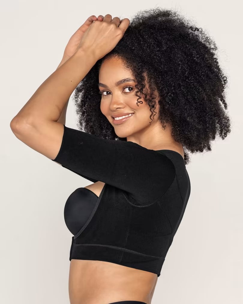 This shaper vest is made of our signature SkinFuse® super comfy compression fabric to smooth out your upper arms and your back. It has short sleeves to smooth out your upper arms. The criss-cross posture corrector bands in the back offer back support. Its open bust design lets you wear your own bra underneath, and it has a special design in the front to lightly center the bust. A 4-level front hook-and-eye closure lets you create the perfect fit. Plus, our seamless fabric won’t show under your clothes.