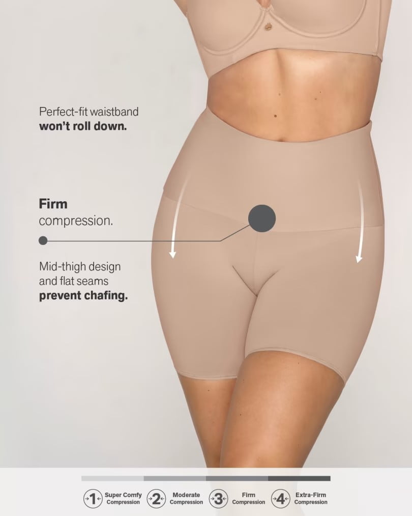 Short but sweet! This slip short is made of our trademark DuraFit® moderate compression fabric. The double-layered, high-rise DuraFit® waistband is designed to comfortably flatten your tummy and shape your waist. Single-layered fabric in the legs softly compresses your thighs and prevents chafing. Moisture-wicking fabric keeps you feeling fresh and dry no matter what.