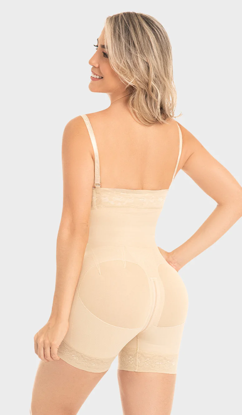 Short molding girdle with silicone strapless, includes removable straps that adjust to size, has a diagonal closure and internal hooks that provide support, has control in the abdomen, with triangular reinforcement, natural enhancement of buttocks, also includes silicone in the upper contour and legs, to eventually be used without straps and stay in place.