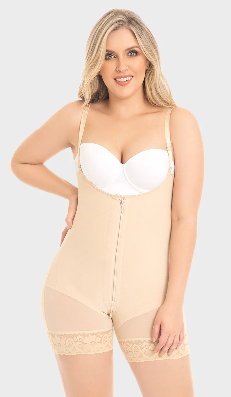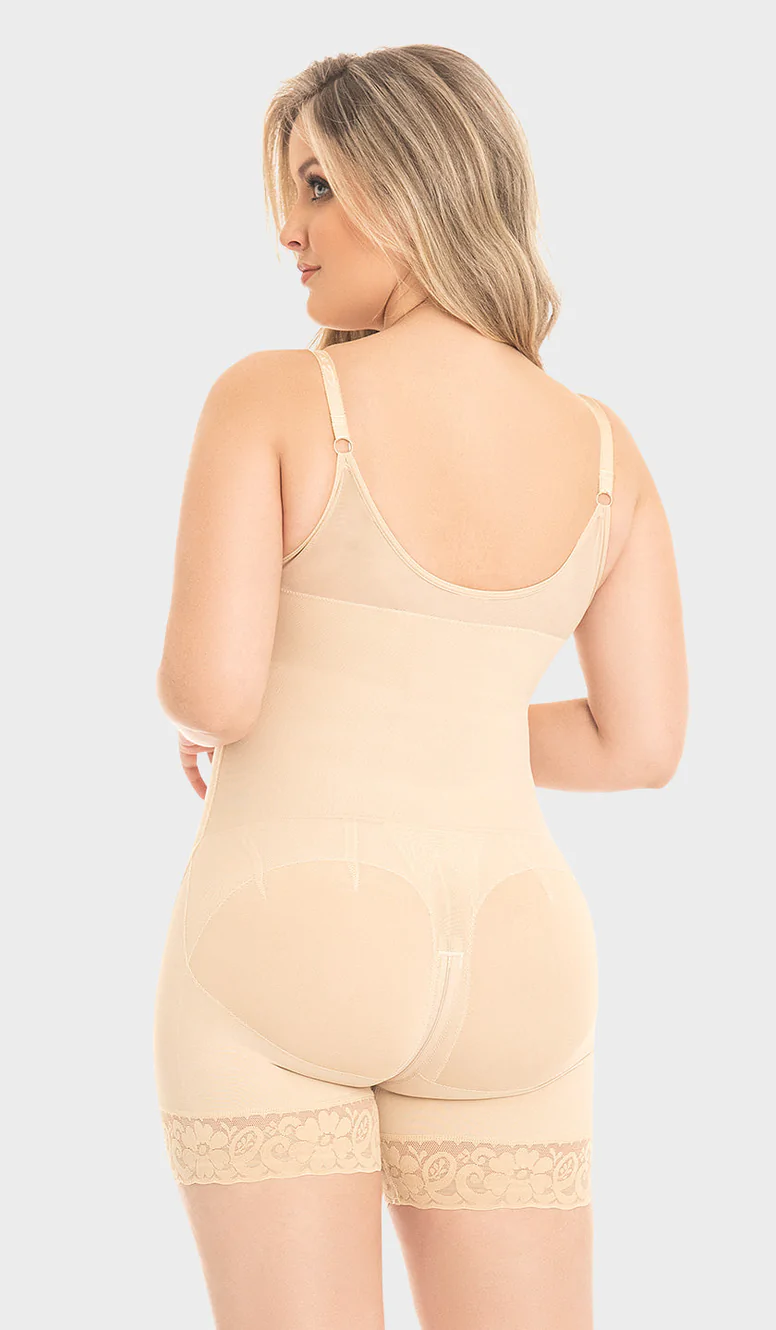 Short shaping girdle with closure, includes, it has a level of internal hooks that help support the closure, it is a comfortable and discreet garment, it has back control, adjustable straps and removable shoulder pads that offer support in this area. It has silicone on the legs preventing it from rolling up, a zipper at the bottom for bathroom use and natural enhancement on the buttocks with an exclusive and discreet design.