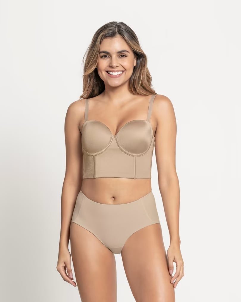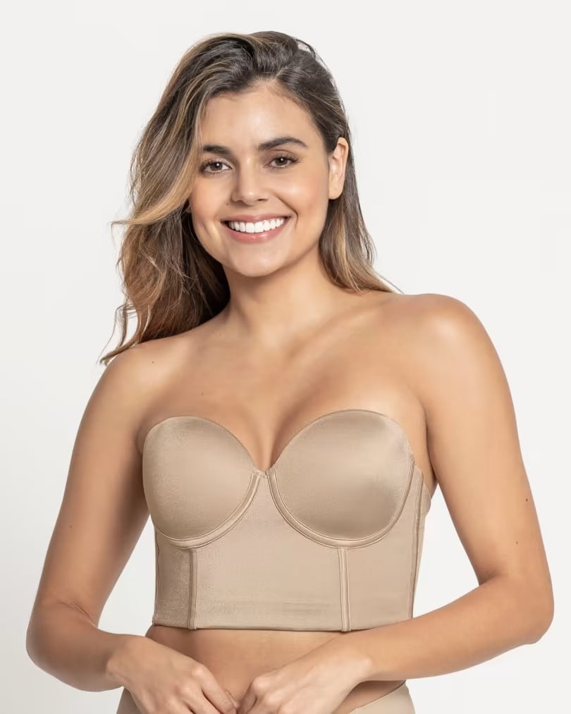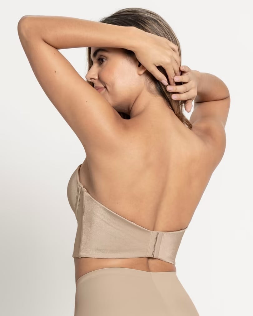 A strapless bustier bra with full-coverage balconette cups, ergonomically designed to stay in place.