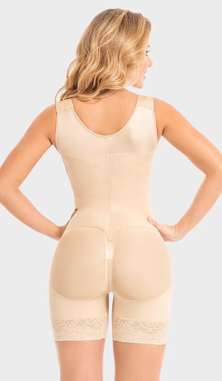This is a short girdle with wide and padded straps on the shoulders, designed with comfort in mind by providing control in the abdomen, waist and back. This girdle is of medium compression, with natural enhancement in the buttocks, totally covered in the back. It has a pear-shaped abdominal reinforcement and greater hip capacity for buttock procedures.